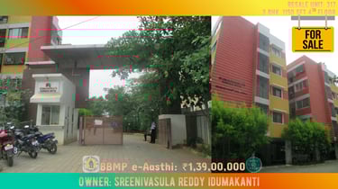13 Years old resale unit, part of 224+2 unit gated community that is online from its launch in various estate portals. Being built on 3 Acre 18 Gunta land site, it is always recognizable for its areal views, street views, ratings and reviews, community features and structure in the online maps. Constant resale listings put all the updated information through various estate portals including latest registrations, loans etc. Even BBMP (GBA-EAST) & Department of Registration Karnataka have enabled online verification and sale. Sale is only through owner's linked KYC & operating Bank accounts only. This website is organized based on location & accessibility (Market), Architecture, Construction and Management (Technical), Property Documents (Legal Verification). This is most common verification approach adopted by banks and suggested online. Detailed discussion is carried out post your decision to show intent regarding fixtures, fittings and interiors to adjust pricing based on your observations of unit media before finalizing since they are aged 13 years. This is a marginal amount and requires no big decision effort. Site visit is only after commitment of intent for meaningful, verification. Details will be available on terms of resale page.