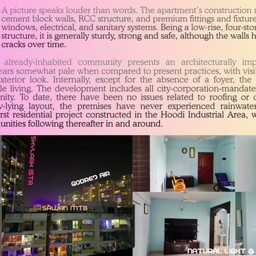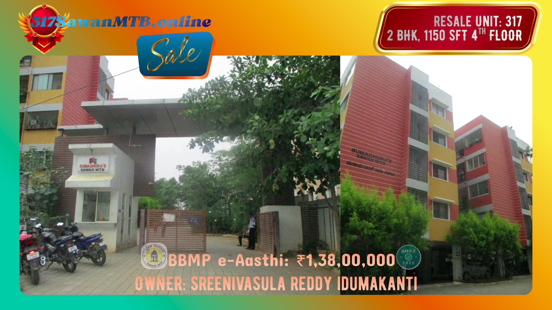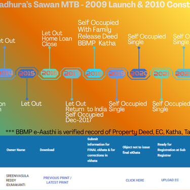 13 Years old resale unit, part of 224+2 unit gated community that is online from its launch in various estate portals. Being built on 3 Acre 18 Gunta land site, it is always recognizable for its areal views, street views, ratings and reviews, community features and structure in the online maps. Constant resale listings put all the updated information through various estate portals including latest registrations, loans etc. Even BBMP (GBA-EAST) & Department of Registration Karnataka have enabled online verification and sale. Sale is only through owner's linked KYC & operating Bank accounts only. This website is organized based on location & accessibility (Market), Architecture, Construction and Management (Technical), Property Documents (Legal Verification). This is most common verification approach adopted by banks and suggested online. Detailed discussion is carried out post your decision to show intent regarding fixtures, fittings and interiors to adjust pricing based on your observations of unit media before finalizing since they are aged 13 years. This is a marginal amount and requires no big decision effort. Site visit is only after commitment of intent for meaningful, verification. Details will be available on terms of resale page.