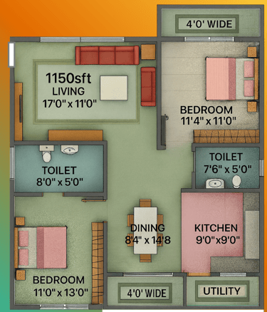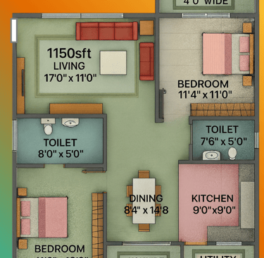 Dining Area is wide enough to hold 6 chairs but comfortable with 4 chair table. It also holds common are that lead to all the rooms. Common area can accombidate a dining or multipurpose cabinet and art. Dining is attached to common balcony and open kitchen.
