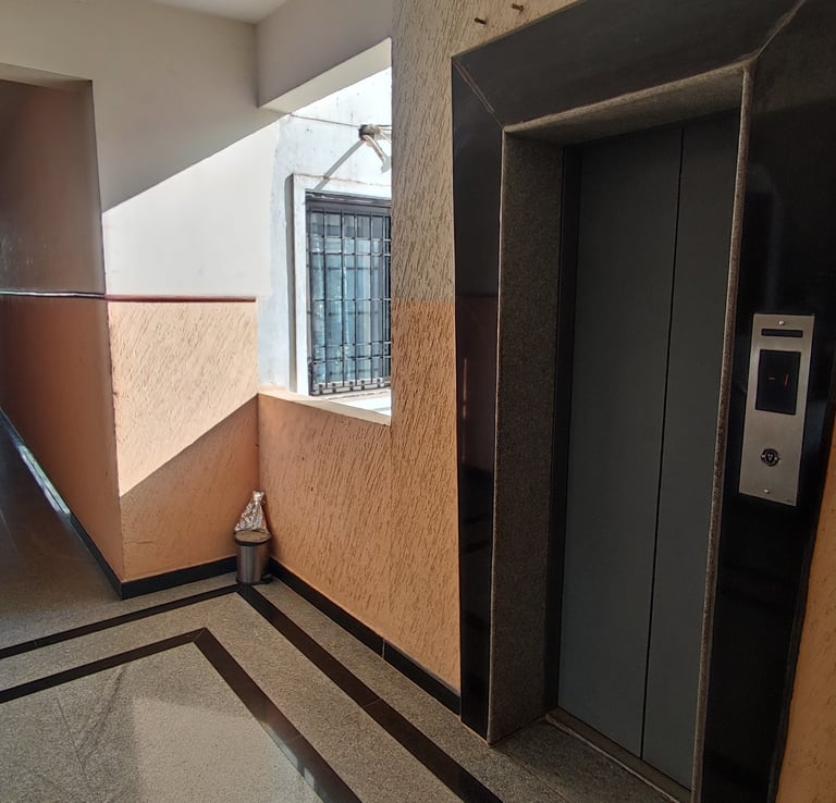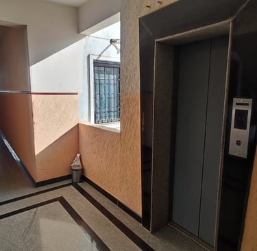 The corridors are 4ft wide and houses lift and staircases in the middle space. The place can hide garbage place outside, can hold shoe racks if choose to keep outside. Since the flat is in 3rd floor it is easy to have fresh open sky on and off. You can enter corridor from ground and cellar. From ground you can only walk, and it provides easy access to back gate.