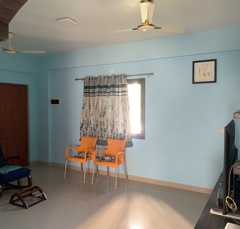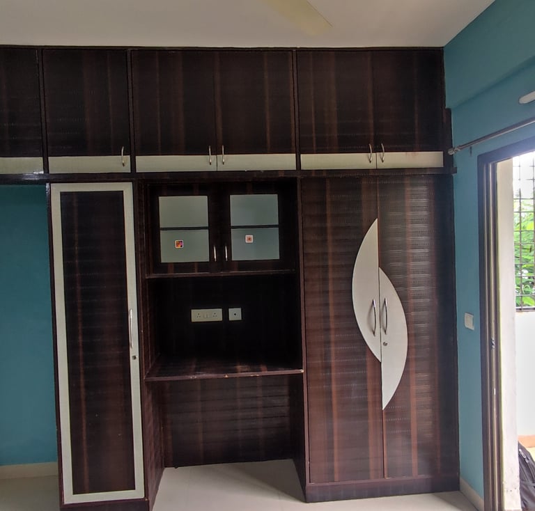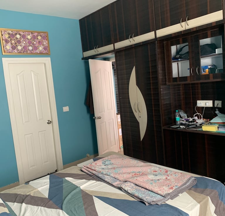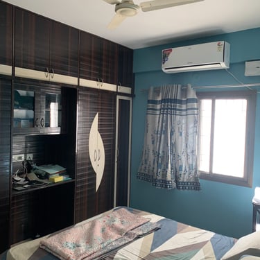 Master Bedroom has attached bathroom and has enough space to use King Bed. Current wardrobes are functional but may not provide experience since they are 12 yr old. 12 years is longer, but they can serve another 5 to 7 years easily. It has vent for AC and it is quite and mildly darker room.